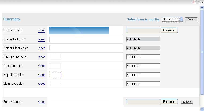 To change the header or footer image simple click "Browse" and navigate to the desired image on your computer. Click on the file and then click "Submit" on the bottom right of the editor page. The size of the Header image for the profile boxes to the left of the screen is 256x32 pixels, and 714x34 pixels for the boxes to the right of the screen.
