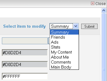To add a picture as your profile page background image, first select "Main Body" from the "Select Item to Modify" menu. Next click the "Browse" botton and select the picture from your computer files. Then finally the submit button.